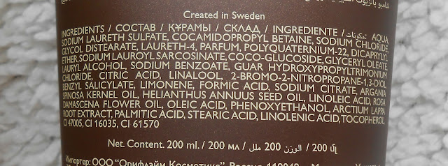 V temno rjavi tubi z zlatim napisom se nahaja 200 ml šampona, ki se ob stiku z vodo lepo speni in že manjša količina je dovolj za pranje dolgih las. Šampon ima dokaj močan sladek vonj v tubi, ki pa je meni osebno po nanosu manj izrazit, ampak mi je kljub vsemu prijetno všečen. Vem, da si večina punc šamponira lase dvakrat, vendar sama prisegam na enkratno šamponiranje – prvič iz navade in drugič, ker dejansko ne opažam nobene razlike na laseh, če si jih operem dvakrat s šamponom in si zato raje prihranim čas. Opažam, da pri tem šamponu drugo šamponiranje niti ni potrebno, saj šampon moje lase očisti zelo dobro že po prvem. Druga stvar, ki jo opažam pri uporabi tega šampona, je, da se moji lasje ne mastijo tako zelo hitro. Sicer sem šla skozi dolg proces, da so moji lasje dosegli raven, na kateri so danes, saj so se mi včasih, sploh v času študija v Ljubljani, zmastili v roku enega dneva in sem jih potem morala prati vsak dan, če nisem hotela grozno izgledati. Če se mi torej danes lasje zmastijo po enem dnevu, lahko rečem, da ne gre za dober šampon. Oriflameov šampon mojim lasem odgovarja, če je res primeren za vse tipe las, pa ne morem povedati, saj bi ga za to morali preizkusiti tudi osebi z mastnimi in suhimi lasmi. Cena šampona je6,99 €, trenutno pa ga lahko kupite po znižani ceni 3,99 €.
