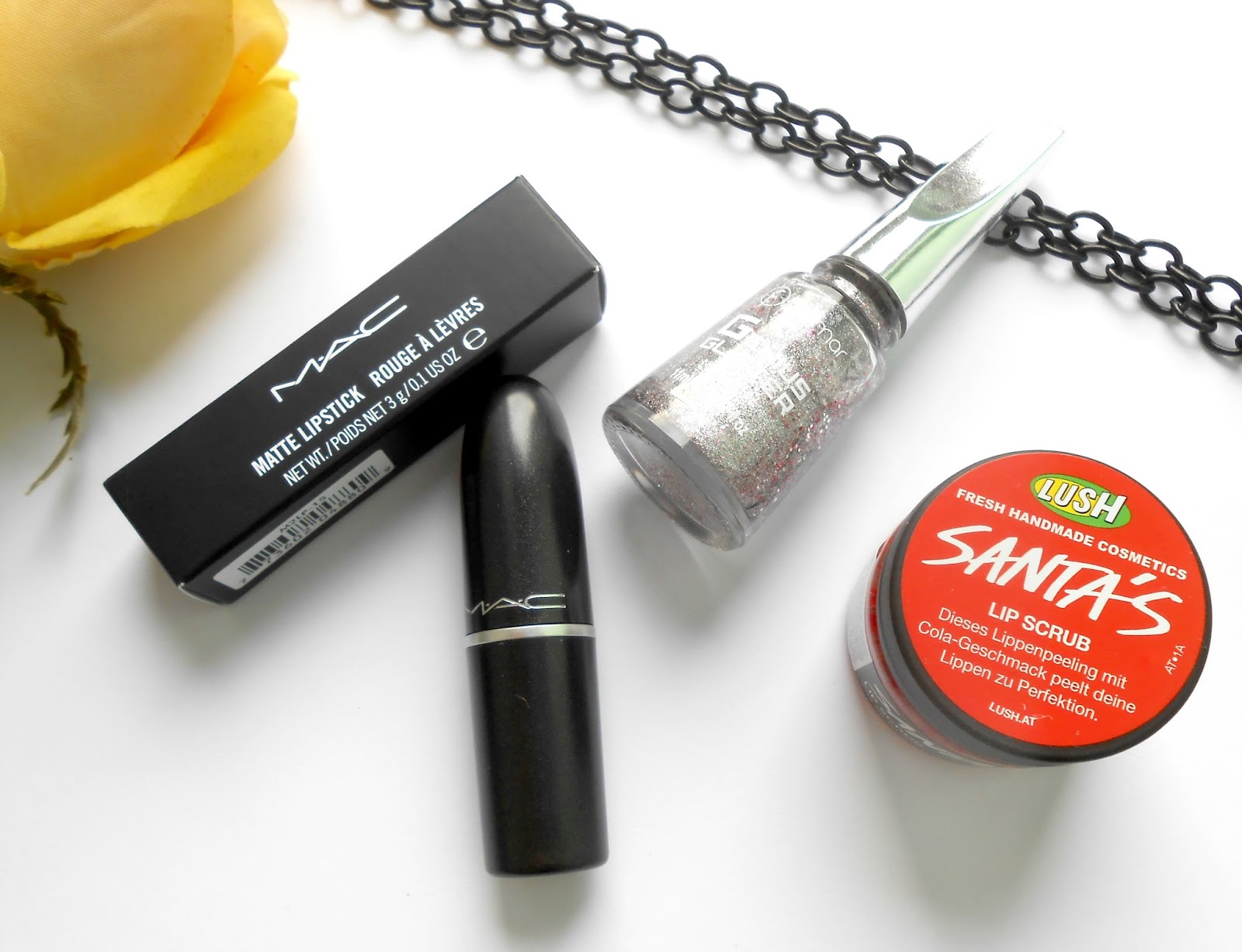 I visited three more stores. In Lush I bought Santa's lip scrub, because I really wanted to try it. In Flormar my darling got me a glittery nail polish, which is also amazing, and in Mac I got a lipstick that was on my WL for a very long time, a Lady Danger. It's so exciting to finally own a Mac product. :)